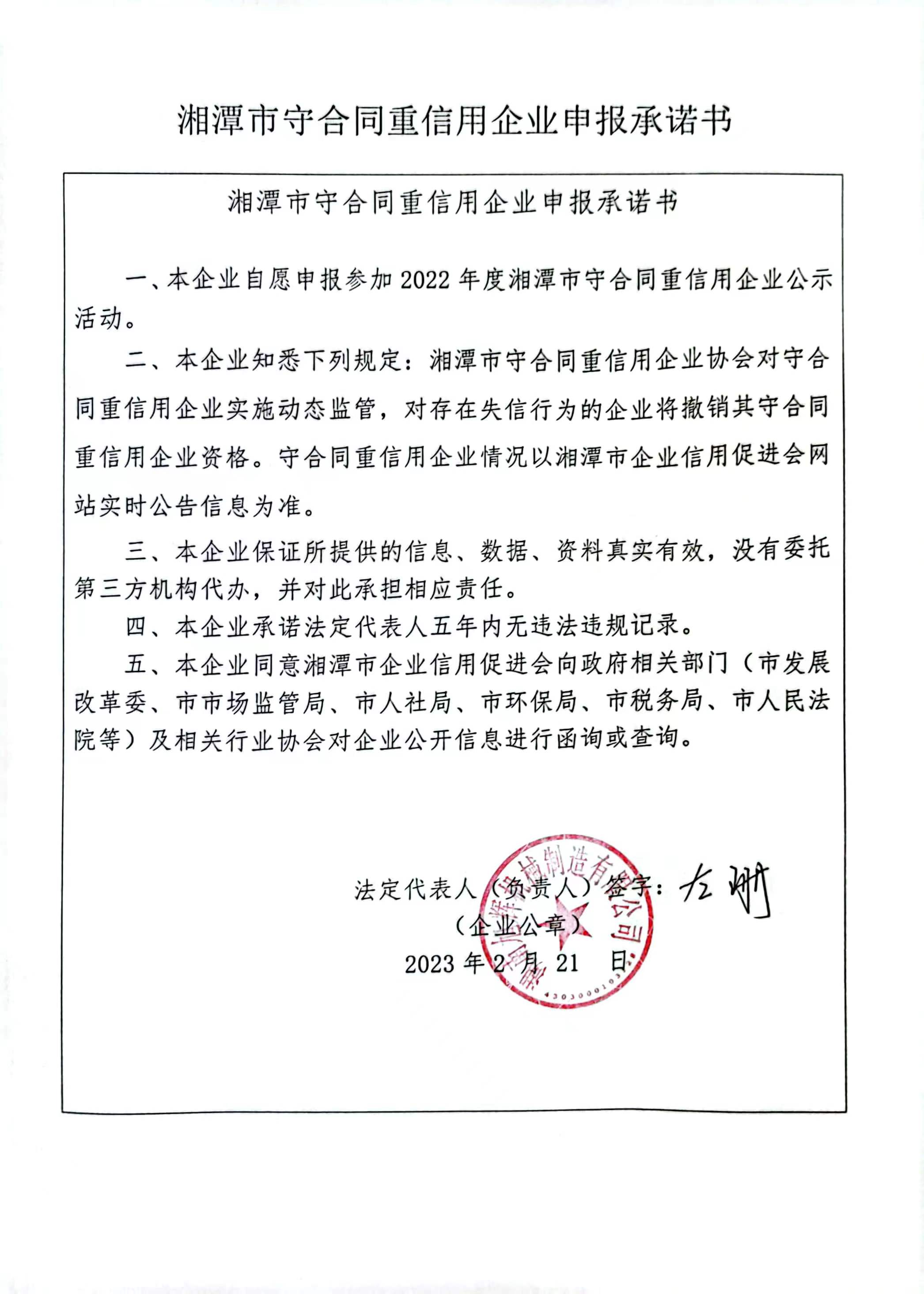 本企業(yè)根據(jù)《湘潭市守合同重信用企業(yè)申報(bào)規(guī)定》等編制 2022 年度企業(yè)信用報(bào)告書,并保證本報(bào)告書內(nèi)容真實(shí)、準(zhǔn)確、完整。